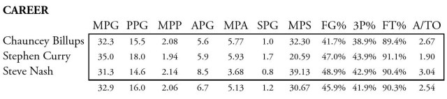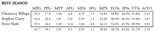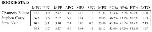 Steve Nash only played 10.5 mpg his rookie season while Chauncey played 27.7. To compare how they did when they were both given over 30 minutes per game (where we project Jimmer to end up) we’ve added the above graph.