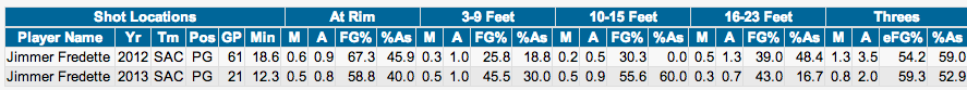 Last year Jimmer played 35% of the teams available minutes and while on the court the Kings averaged 5.7 less points per 100 possessions while giving up 1.1 more points per 100 possessions. They were -10.2 net points per possession with Jimmer playing and -3.4 net points per possession without Jimmer. That is a fairly large difference and surprisingly it was the offense that struggled much more with Jimmer on the floor than the defense.